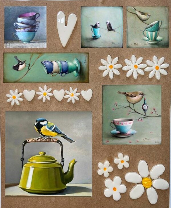 A pack of tiles and inserts on a card with the theme of Tea Birds.