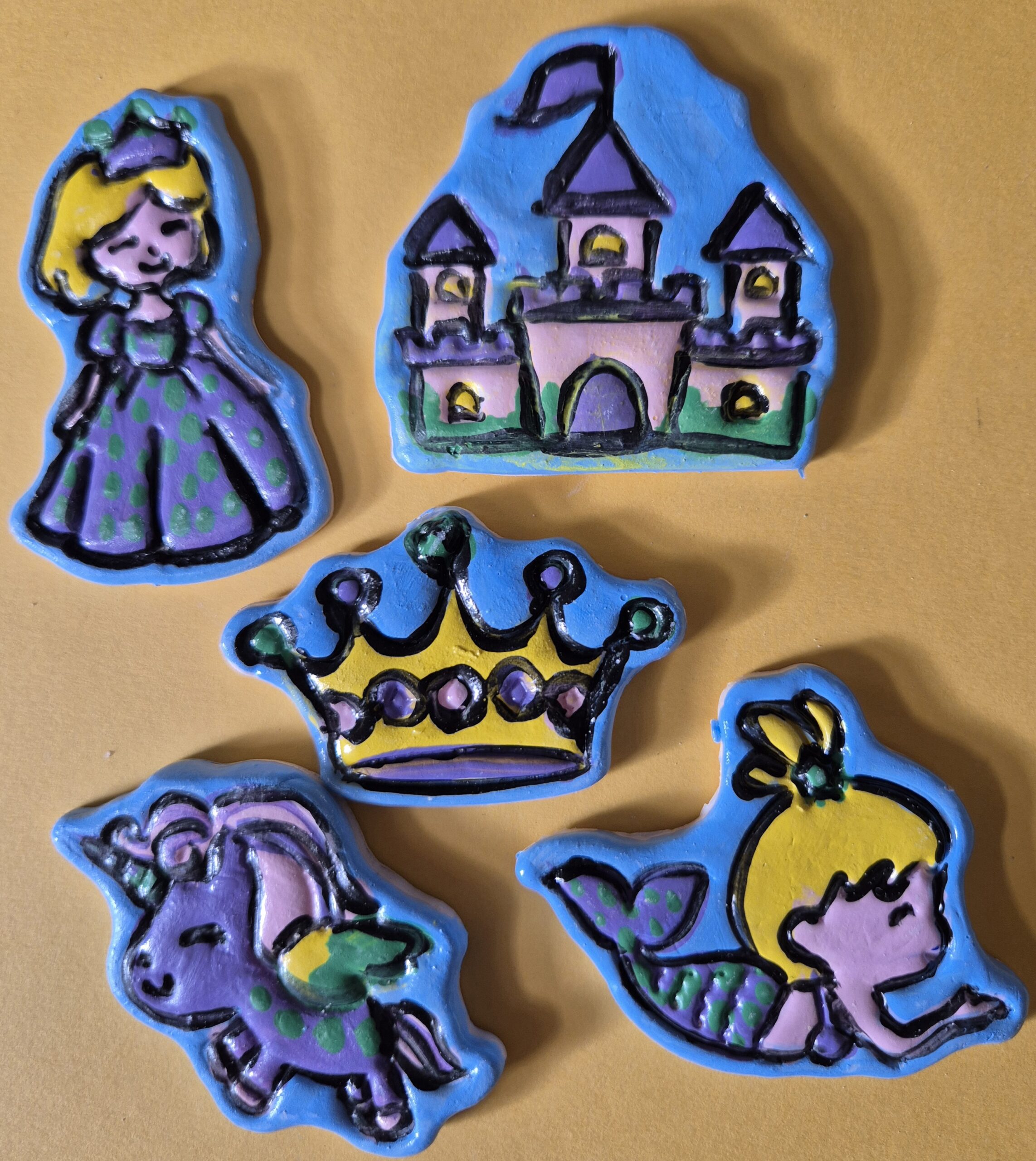 Sets of 5 delightful princess characters to paint and attach to a magnet.
